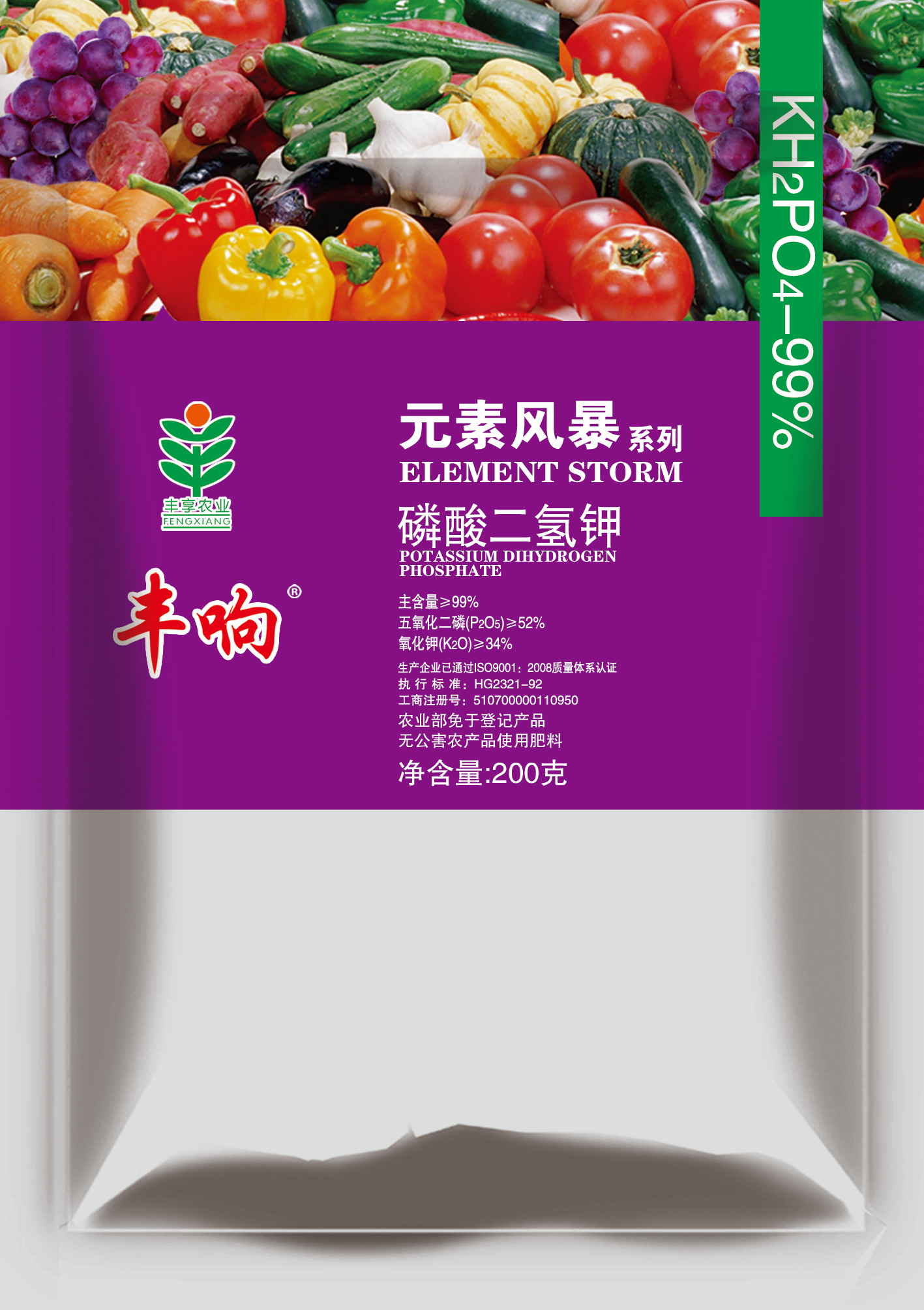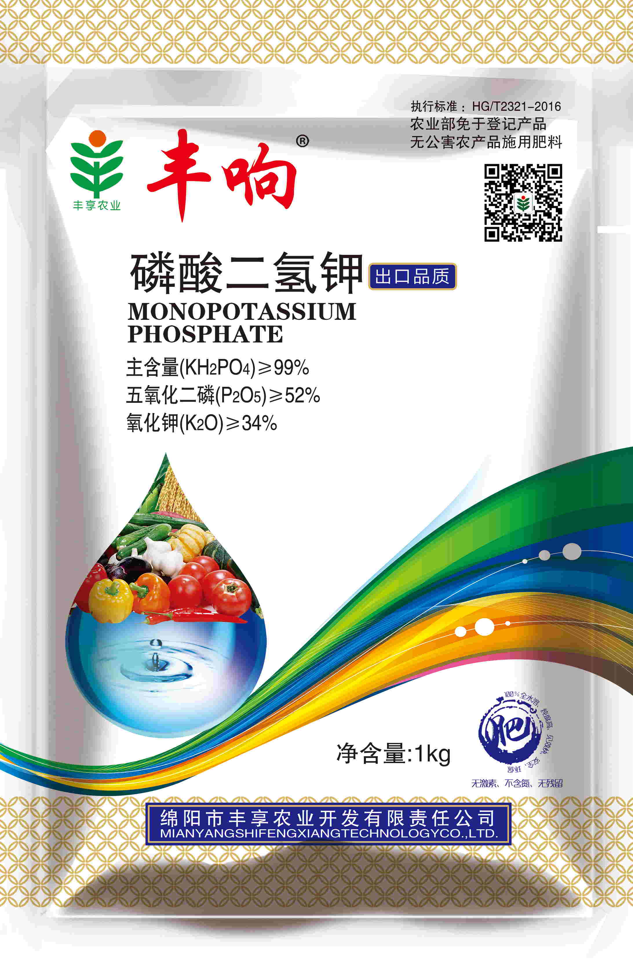 執行標準HG/T2321-2016,豐響熱法99%高品質磷酸二氫鉀。能有效為植物提供速效磷鉀,壯根、狀桿、抗旱、抗寒、抗逆、抗倒伏、促花、保花、保果、改善品質、提高產量。